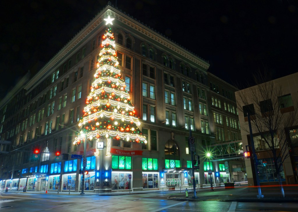 The 100-foot tall Christmas tree that wraps around the corner of the former Joseph Horne Dry Goods Company at the corner of Stanwix Street and Penn Avenue has been part of the holiday celebration in downtown Pittsburgh since 1953. There are over 2,500 lights and 2,000 festive ornaments on the tree.