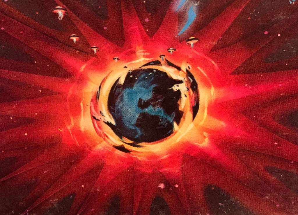 The cover was designed by prolific graphic artist Paula Scher and illustrated by Roger Huyssen. Scholz wanted a guitar on the cover, but Scher thought a guitar would be ‘too cliche’. She and the Epic Records product manager compromised with a guitar-shaped space ship. “The first space ship cover idea we showed Scholz had a Boston invasion of the planet, but Scholz said that space ships should be saving the planet, not attacking. So we came up with the Earth-blowing-up idea”, she said.