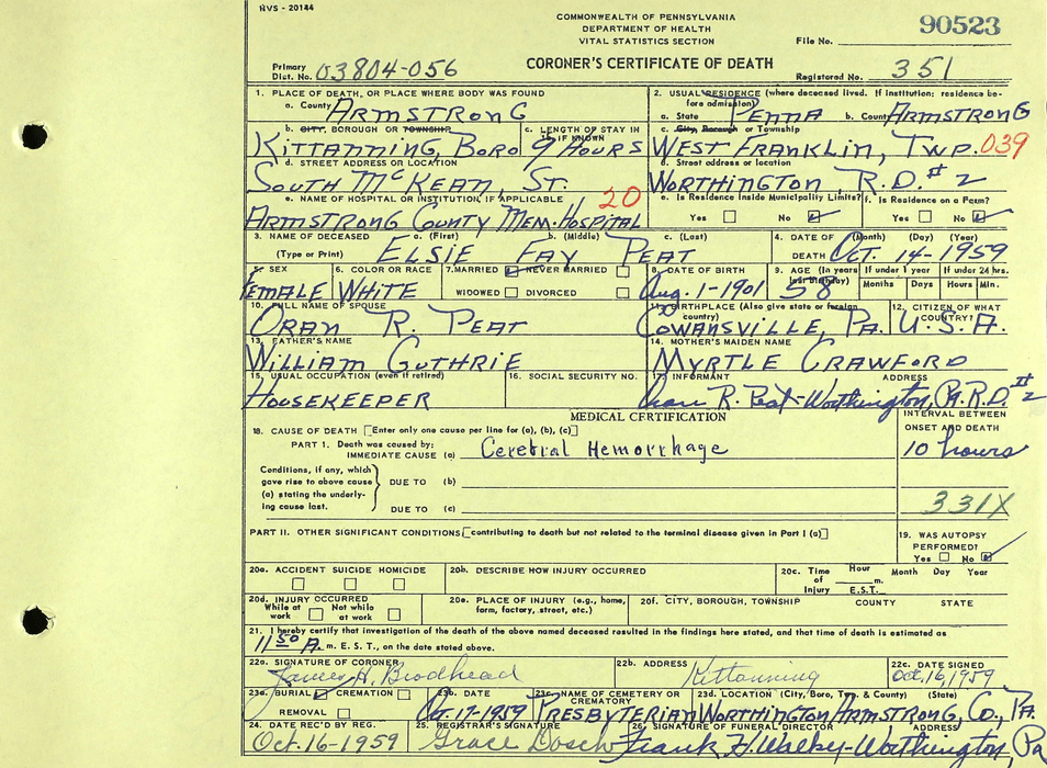 Mrs. Elsie Fay (Guthrie) Peat, 58-year-old wife of Oran R. Peat of Worthington RD 2, died at 12:50 p.m. Wednesday (Oct. 14, 1959) in Armstrong County Memorial Hospital. Born at Cowansville Aug. 1, 1901, she was a daughter of William and Myrtle (Crawford) Guthrie. She was a member of the First Baptist Church of Worthington. Surviving are her husband, two daughter, Mrs. Frank (Jean) Koladish of Worthington and Mrs. Chauncey (Janet) Hooks of Alexandria, Va.; seven sons, Richard, Edwin and James of Worthington, Harland and Chalmer of Kittanning, Robert of Buffalo, N.Y., and Thomas, at home; and 16 grandchildren. She is also survived by her mother, of Cowansville, and one sister, Mrs. Harrison Shaffer of Cowansville. Friends are being received at Walker funeral home, Worthington, where services will be conducted at 2 p.m. Saturday by the pastor, the Rev. Howard O. Addleman. Interment will be in Worthington Presbyterian Church cemetery.