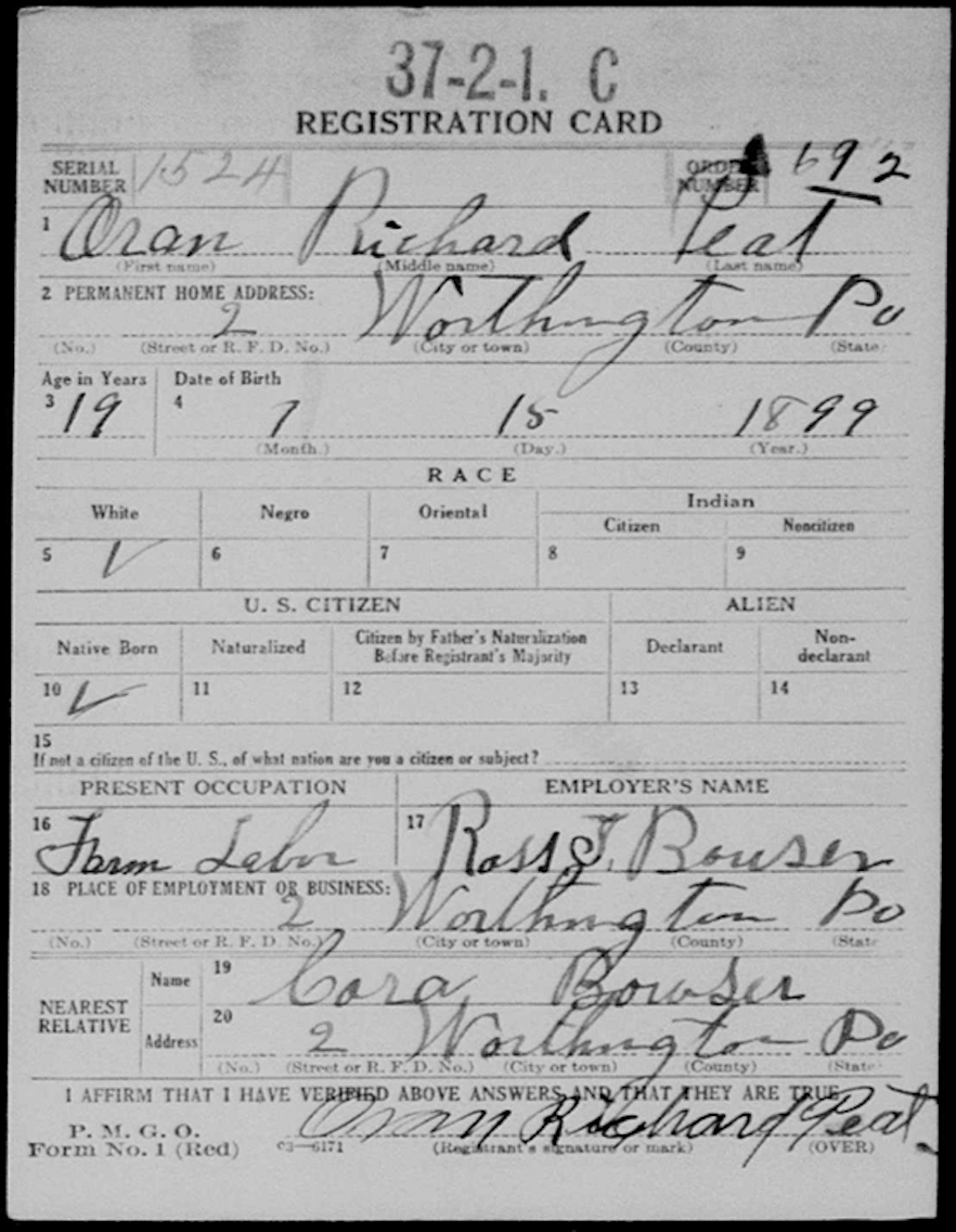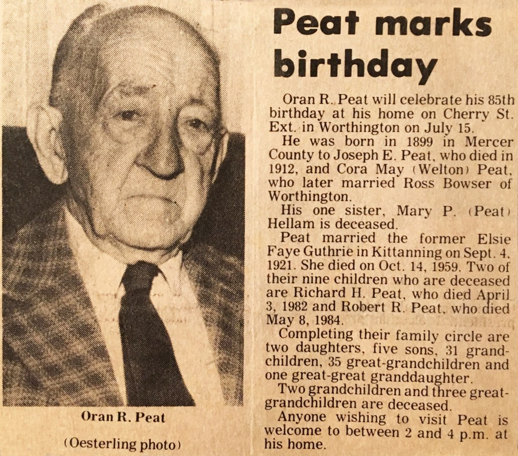 Oran Peat was born on July 15, 1889 to Joseph and Cora Peat in Fredonia, Mercer County, Pennsylvania. On September 4, 1922, he married Elsie Fay Guthrie. They resided on Cherry Street in Worthington, Pennsylvania.