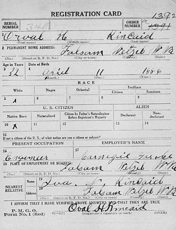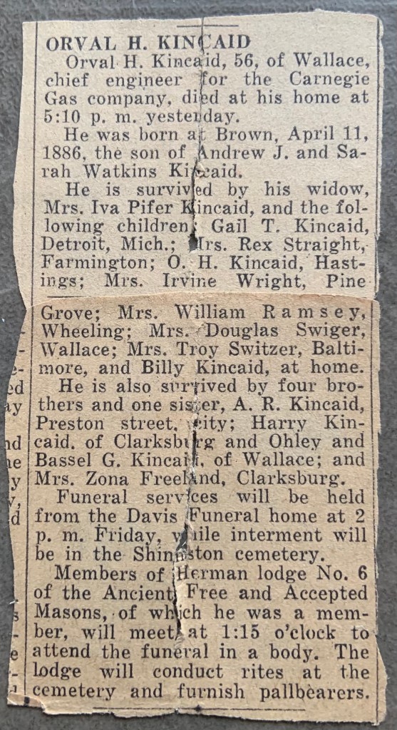 Orval Holmes Kincaid was born on April 11, 1886 in Brown, Harrison County, West Virginia. He was the son of Andrew Jackson Kincaid and Sarah (Watkins) Kincaid. He married Iva “Nellie Bird” Pifer on September 18, 1906.