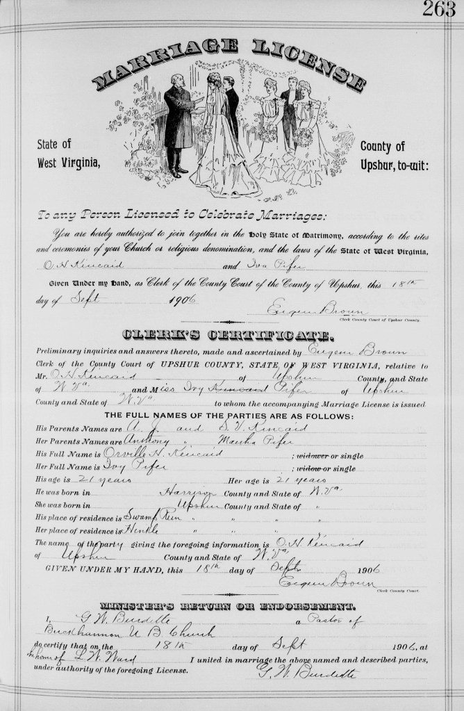 “West Virginia Marriages, 1780-1970,” database, FamilySearch (https://familysearch.org/ark:/61903/1:1:FTYX-6VM : 11 February 2018), O H Kincaid and Ivy Pifer, 1906; citing Upshur, West Virginia, United States, , county clerks, West Virginia; FHL microfilm 816,191.