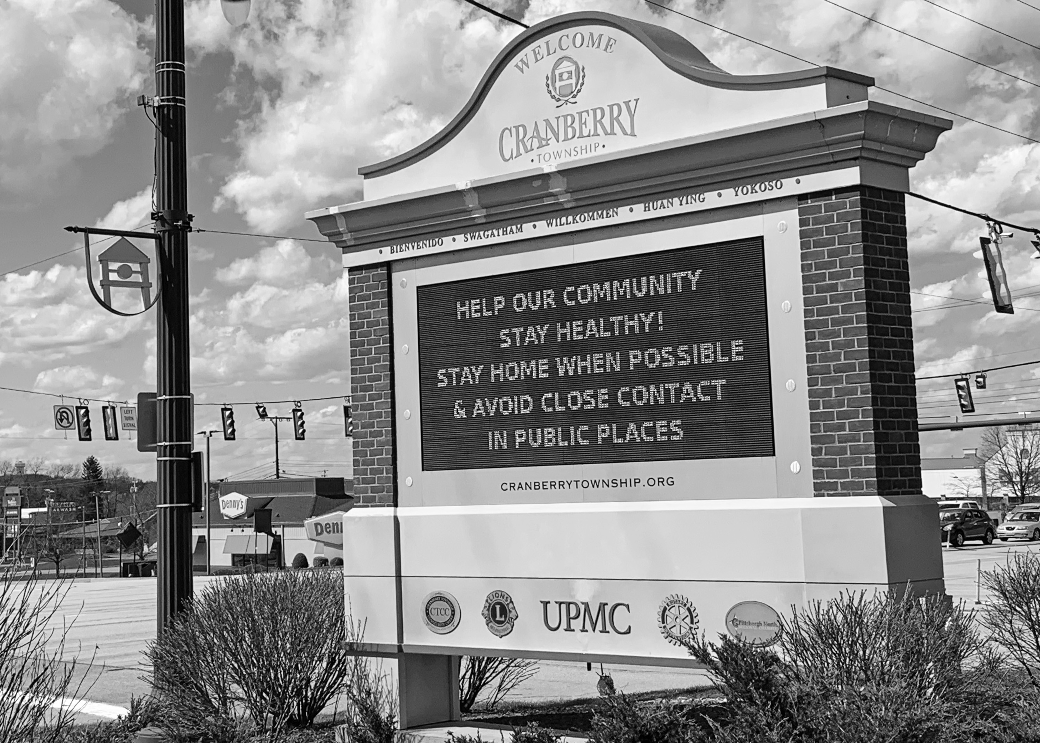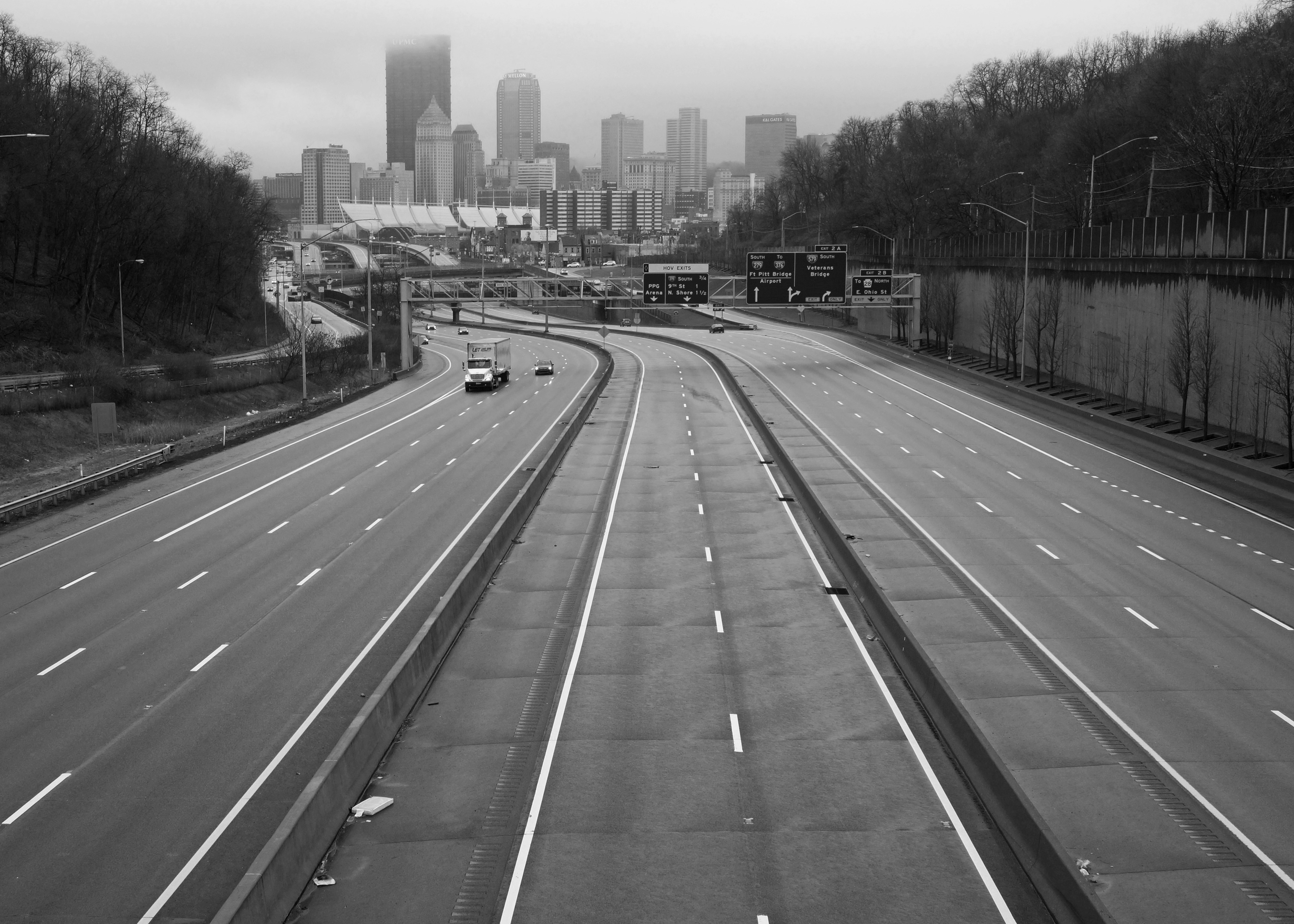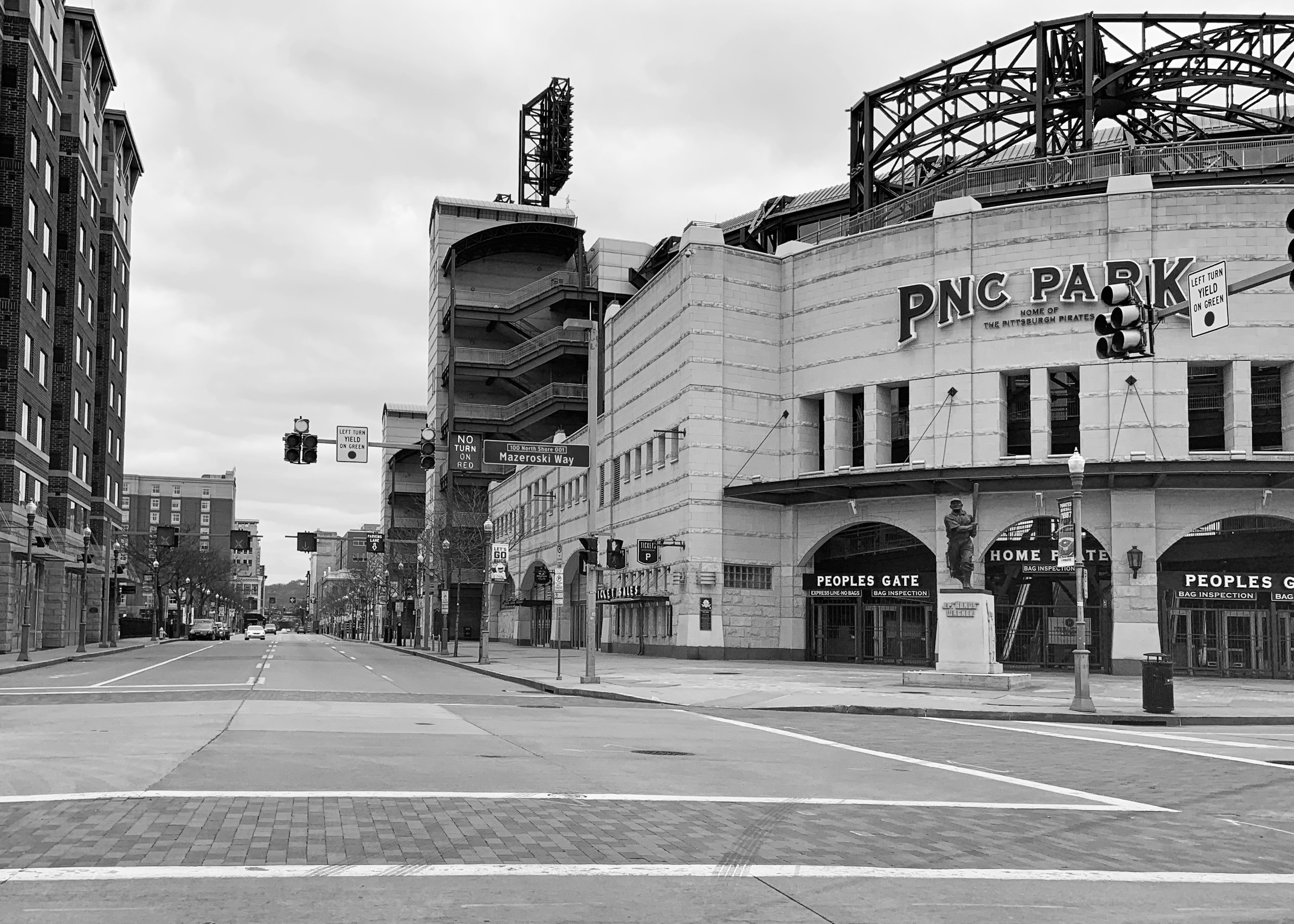 March 23, 2020 The corona virus panic has now resulted in ‘stay at home’ orders. Closures of almost every business is forcing people to stay home. It’s an eerie feeling out. In a fast-paced society, the emptiness and quietness is almost deafening. The photo of the Pittsburgh skyline was taken from a pedestrian walkway above Route 279 at 5:02pm during what should have been rush hour out of a major metropolitan area. These lanes, especially the outbound lanes, should be almost bumper to bumper traffic on a normal day. One lonely bus drives out of the city of Pittsburgh across the Roberto Clemente Bridge. There are no pedestrians. No one entering or leaving the Byham Theater. There were people on the sidewalks behind me, but only a couple. A very quiet and disturbing scene. The PNC Park surroundings are also calm and serene. No traffic. No people. In a culture that thrives on buzzwords, ‘social distancing’ even found its way onto a street sign high above the lanes on Route 279 Northbound.