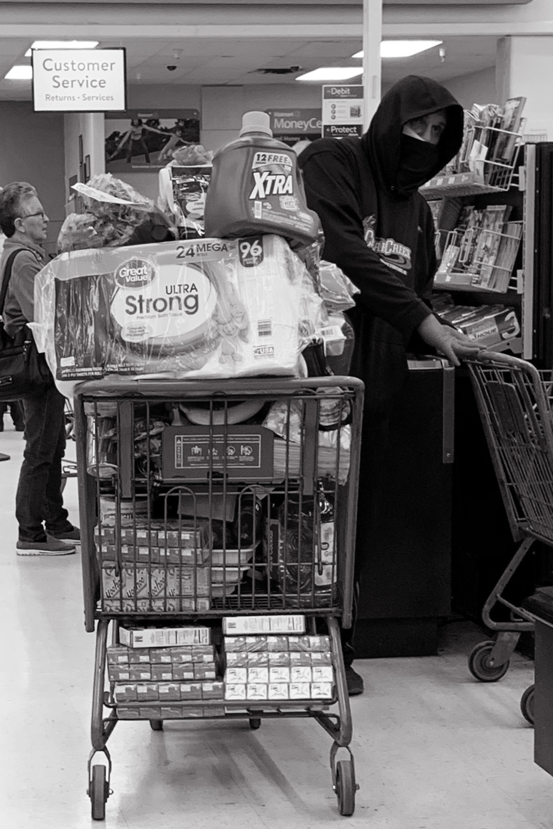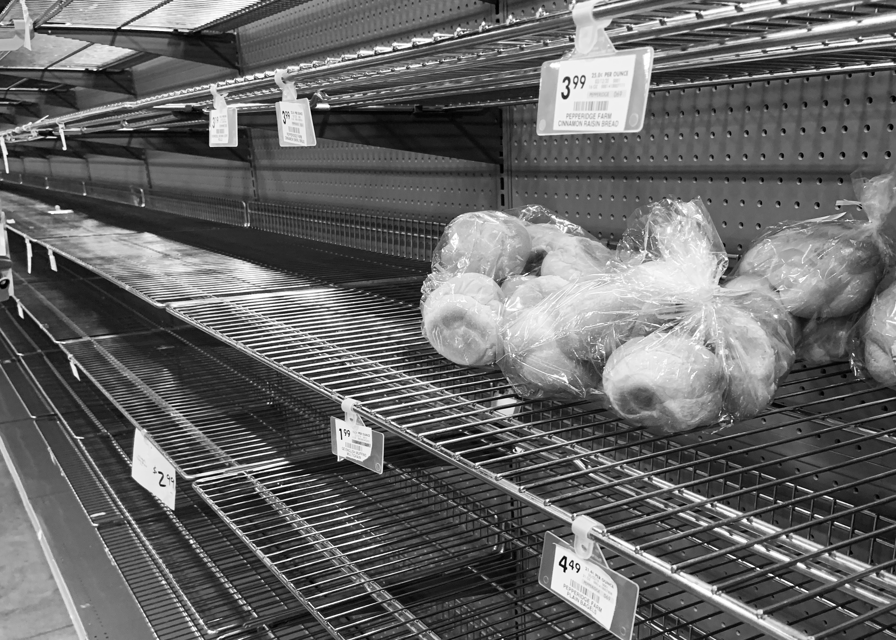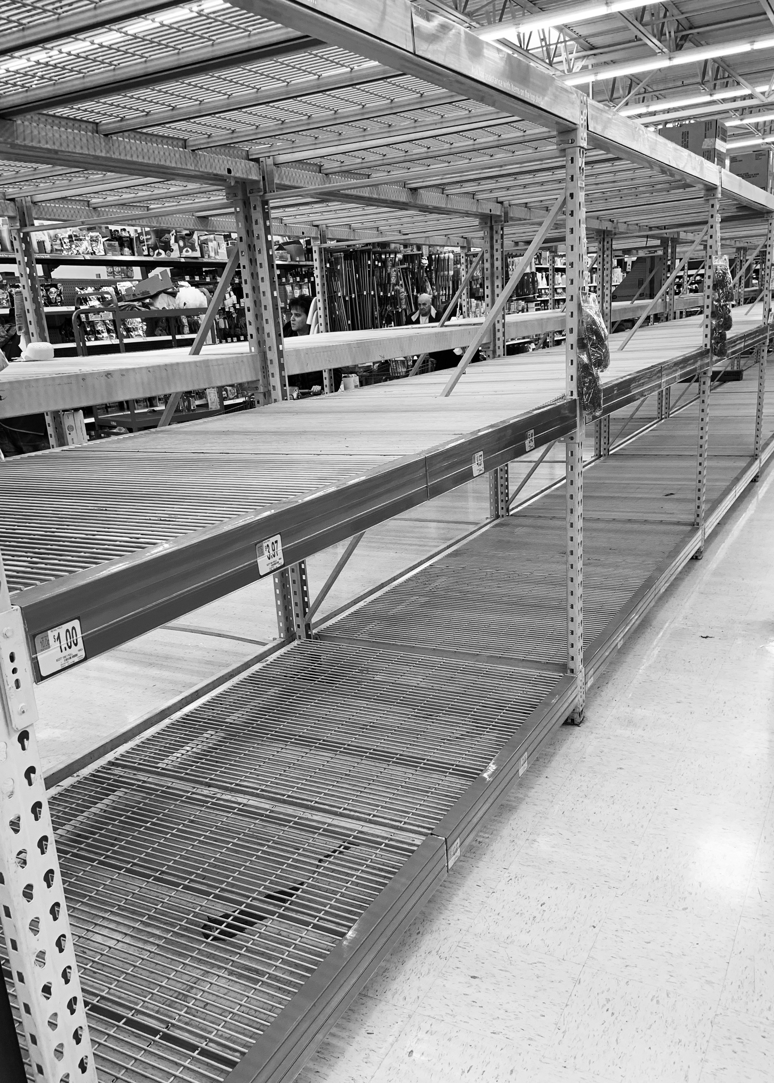 March 15, 2020 As the news stations began wall-to-wall coverage of the corona virus, we all realized that we’re dealing with something we’ve never had to deal with in our lifetime. This kind of fear of the unknown usually results in hoarding necessities like toilet paper, as seen here in the toilet paper aisle at Walmart in Butler, PA. March 16, 2020 A scared shopper, complete with boots, rubber gloves, face mask, suit of armor… and cases of YooHoo. March 17, 2020 There are various things disappearing from the store shelves. So far the grocery supply chains seem to be replenishing the shelves after a day or two, but for some reason people are buying up bread and cleaning supplies right now.