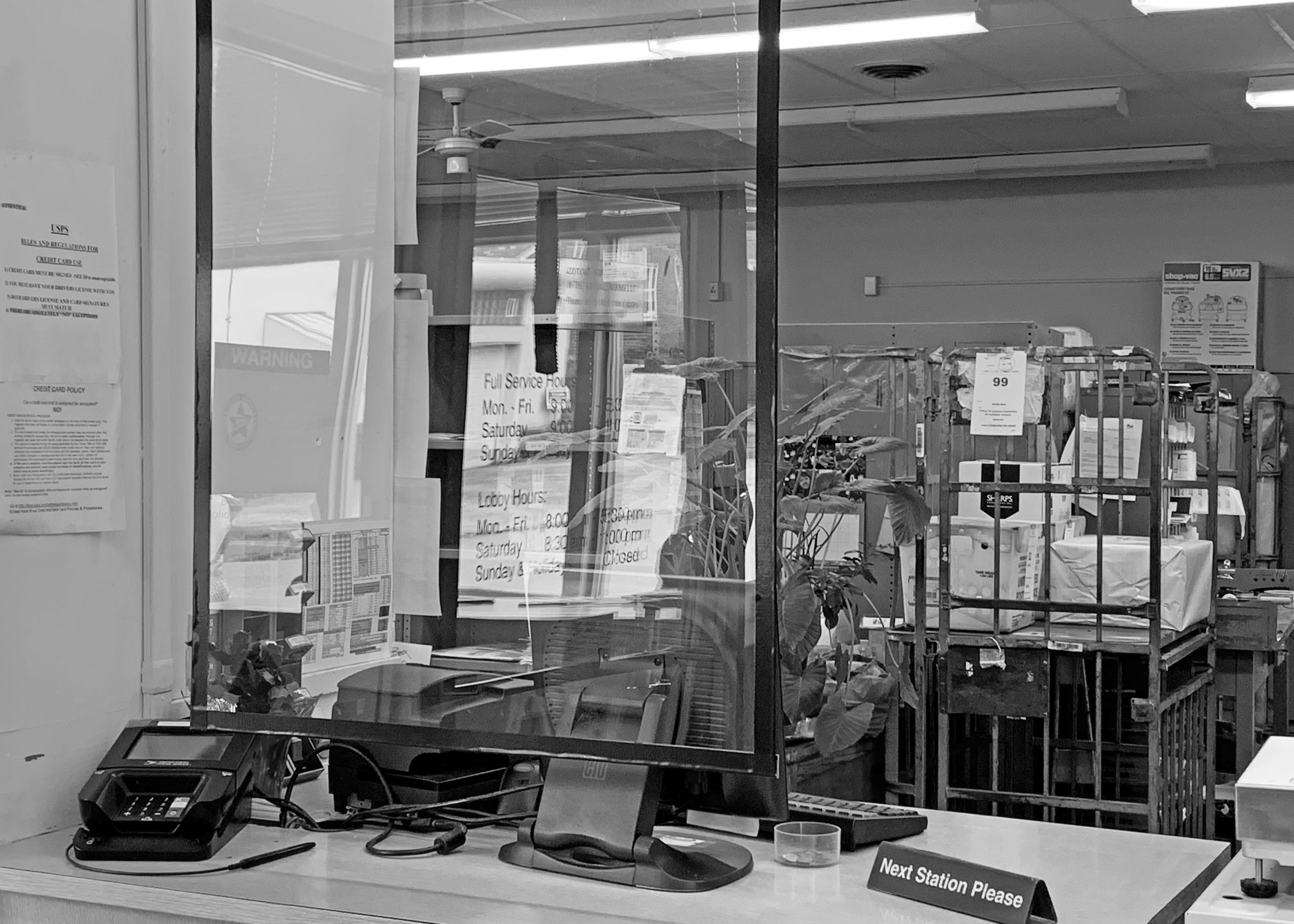 April 6, 2020 All the stores are doing what they can to prevent the spread of the virus. Even plexiglass shields a being placed between the customer and the workers. Is it overboard? Is it working? Who knows, but I wonder why germs weren’t ever an issue in people’s minds before 2020. U.S. Post Office, Lyndora PA