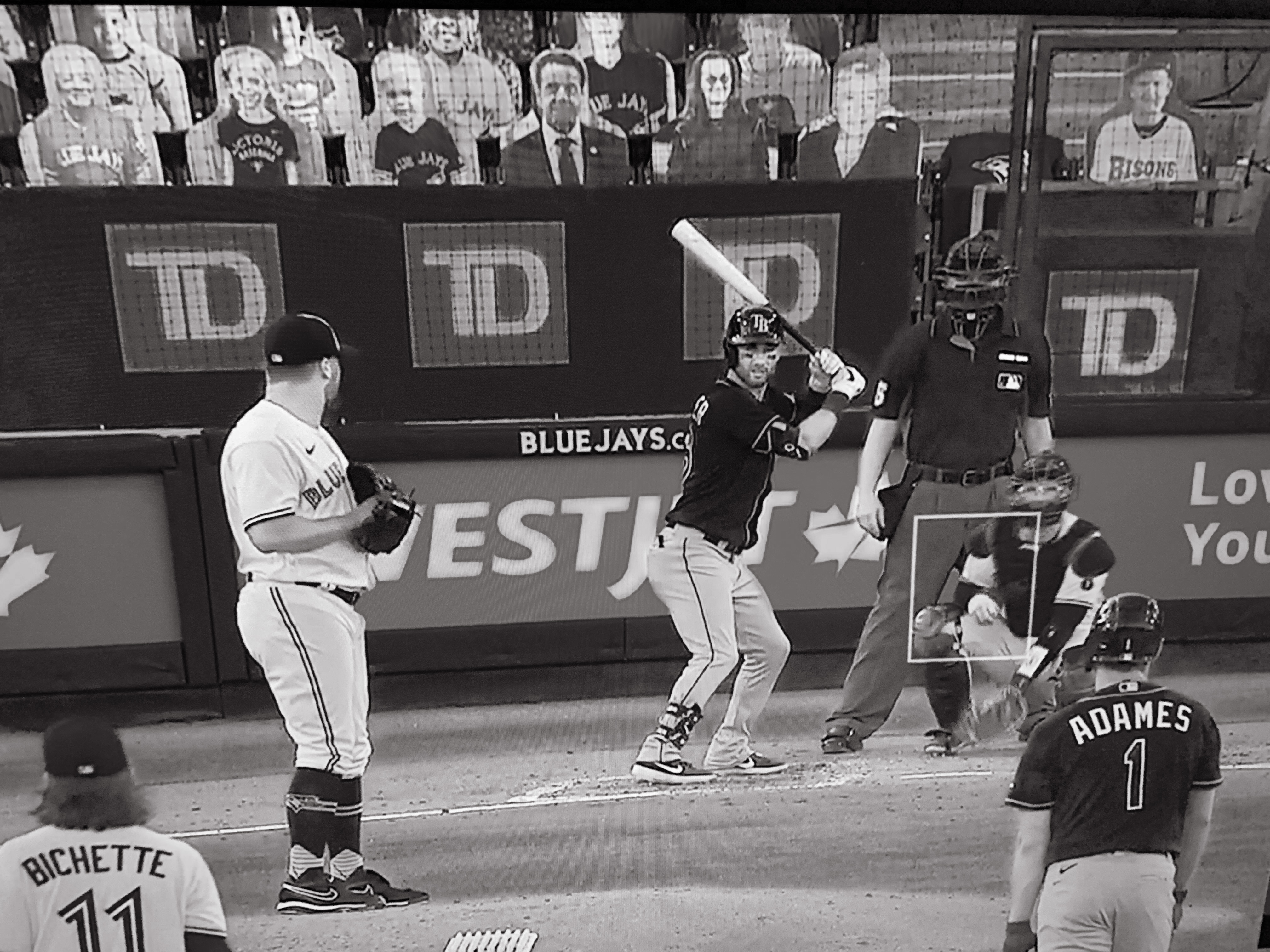 August 14, 2020 It’s a strange phenomenon to put cardboard cutouts at a Major League Baseball game. Rush singer Geddy Lee’s cutout made it to this game. Photo taken from our flatscreen TV.